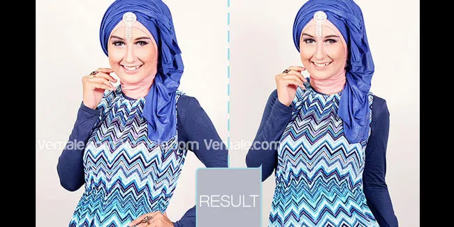 Gunakan jilbab seperti pada model. Gunakan dengan kedua sisi sama panjang. Sisakan bagian belakang agak longgar seperti pada gambar.
